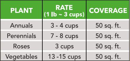 Shrubs: 5 lbs per 100 sq ft Trees: 5 lbs per inch trunk diameter Vegetables & Flowers: Reapply every 4–6 weeks