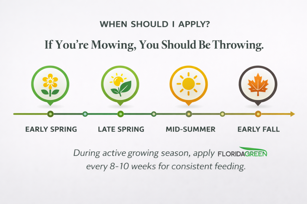 During active growing season, apply FloridaGreen every 8–10 weeks for consistent feeding.